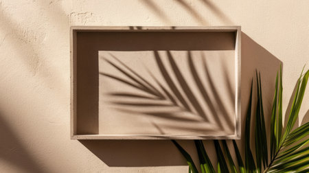 Mock up with rectangle stone frame and natural soft shadow from palm leaves for product presentation or showcase on beige textured background