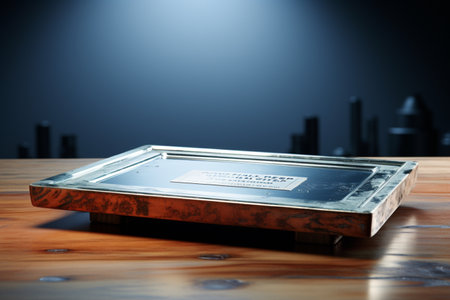 An AI generated illustration of A sleek, black picture frame atop a wooden table with a dark background