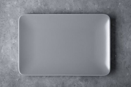 Gray empty rectangular plate over concrete background.