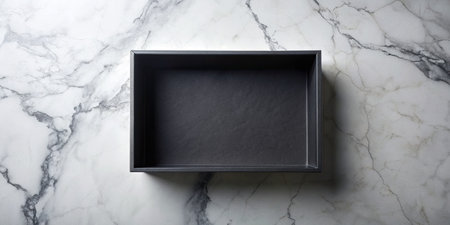 Empty black baking tray on a marble countertop.