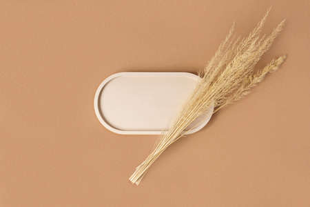 Podium for cosmetic product presentation. Abstract minimal geometrical form on beige background. Oval stone form. Scene, Showcase, display. Minimal design. Soft shadow. Flat lay, Top View. Copy space