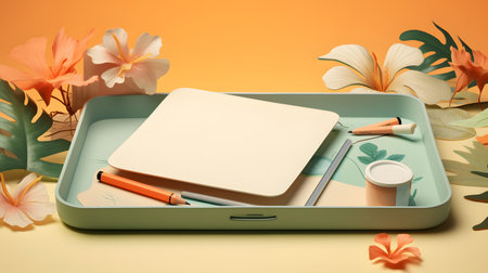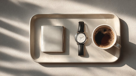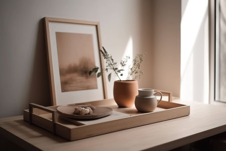 Wooden tray with paper and cup in morning sunlight