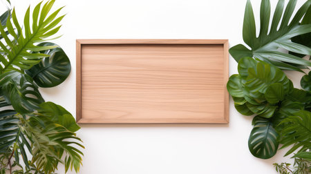 A minimalist overhead view of a pale blue ceramic dish placed on a warm wooden background, accented by lush green foliage.