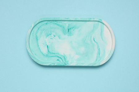 Oval plaster tray on blue background. Top view