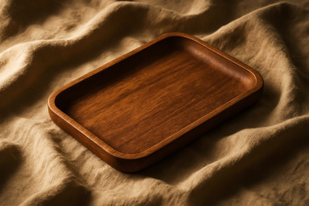 Wooden tray on a linen cloth, close-up, selective focus