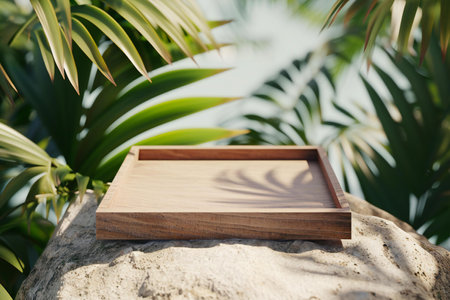 Wooden tray with palm leaves on stone in tropical garden. Mock up