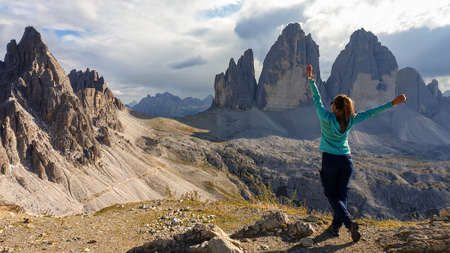 A woman in hiking outfit standing with her arms wide open and enjoying the view on the famous Tre Cime di Lavaredo (Drei Zinnen), mountains in Italian Dolomites. Desolated and raw landscape. Freedom