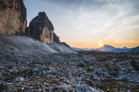 The Tre Cime di Lavaredo and stony plateau in the Sexten Dolomites of northeastern Italy