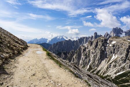 Hiking trail to Cime di Lavaredo with Cadini di Misurina mountain group in background. Dolomites, Italy