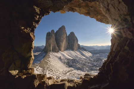 Tre Cime di Lavaredo Peaks from a cave post in the First World War, Dolomites, Italy, Mount Paterno, Dolomites