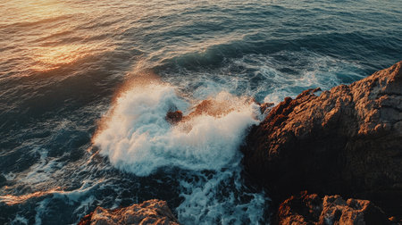 A dynamic composition of crashing waves on a rocky outcrop during golden hour
