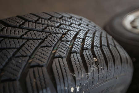 Shallow depth of field (selective focus) image with details of a dirty winter tyre in a car workshop. Sipes and cuts in the tread highlighted.