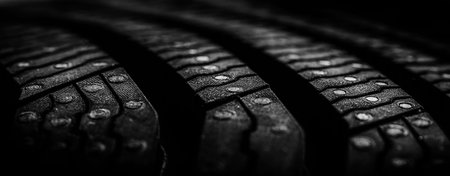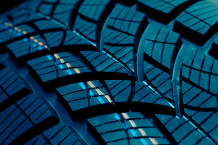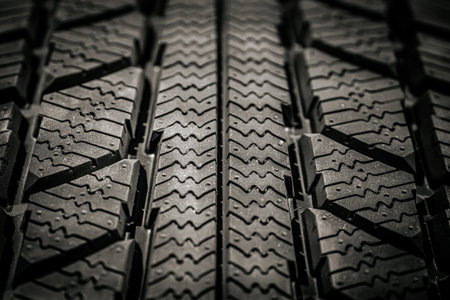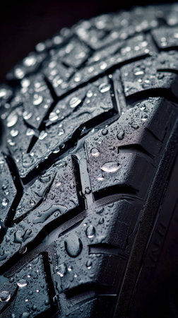 Close-up of winter tire texture, focusing on its intricate patterns and rubber details.