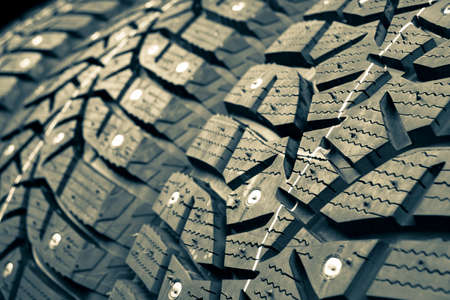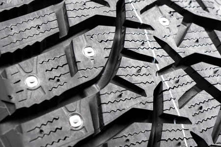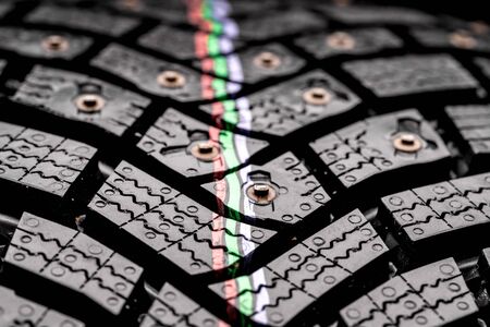 Macro shot winter studded tire. Winter car tires texture. Tyre protector close up. Square powerful spikes. Black studdable winter tyre profile. Car tires