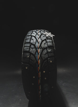 Macro shot winter studded tire. Winter car tires isolated on black background. Tyre protector close up. Square powerful spikes. Black studdable winter tyre profile. Car tires