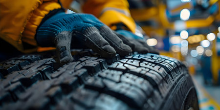 Closeup of auto mechanics hand fixing a tire in repair shop. Concept Auto Repair, Mechanic, Tire Fixing, Close-up Shot, Repair Shop