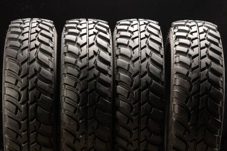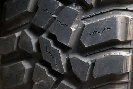 Close-up on the tread of a black tire for an SUV with a rough pattern on rubber. Brutality, rudeness and stiffness of men.