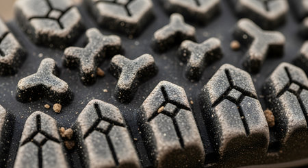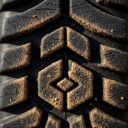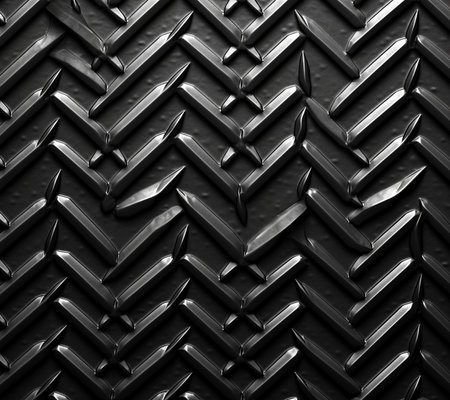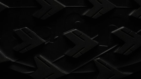 Close-up of a tire tread pattern with sharp lines and geometric shapes, emphasizing texture and design in macro perspective