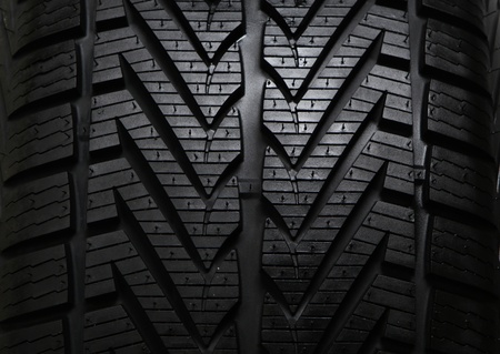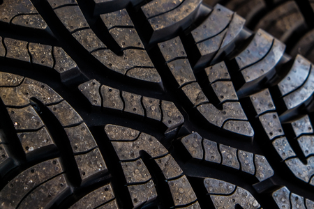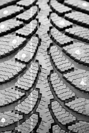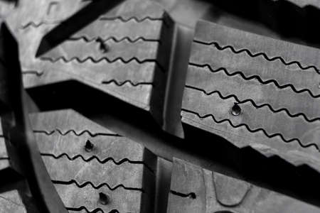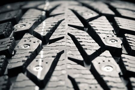 Macro shot winter studded tire. Winter car tires texture. Tyre protector close up. Black studdable winter tyre profile. Car tires