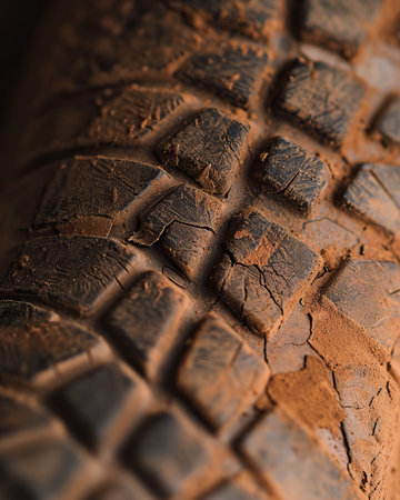 This image captures a close-up view of an aggressive tread pattern on an off-road tire, showcasing intricate details and textures against a muddy background.