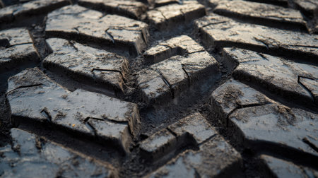 Close-up of rubber tire tread displaying a diamond pattern with grooves, highlighting texture and shadows against a dark background