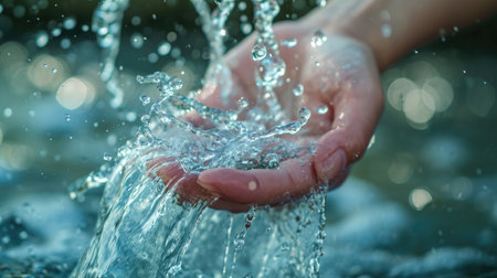 A serene image of a hand reaching out to catch sparkling water droplets, capturing the essence of nature and tranquility in soft lighting.