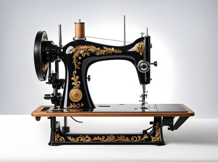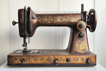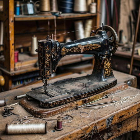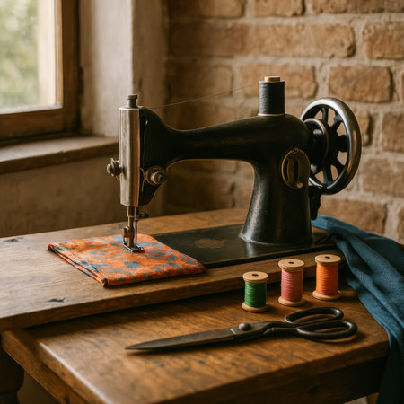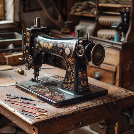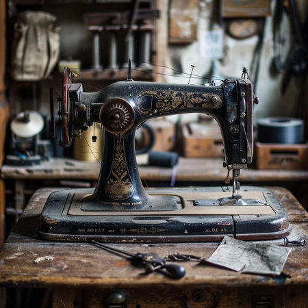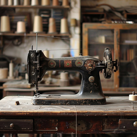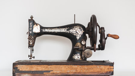 This illustration showcases a vintage aesthetic through a soft color palette and natural lighting, creating a nostalgic mood. Ideal for crafting blogs, sewing tutorials, or DIY project guides, it appeals to hobbyists and professionals in the textile industry. The detailed texture of the wood and machine adds depth and authenticity to the composition. AI-generated illustration.