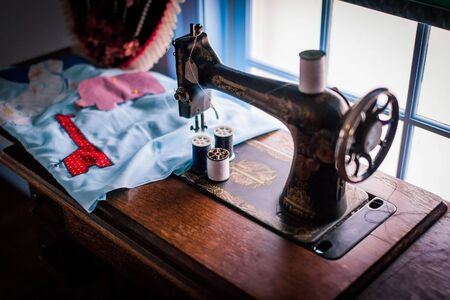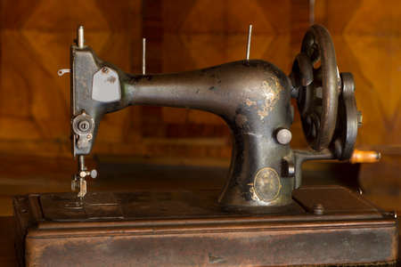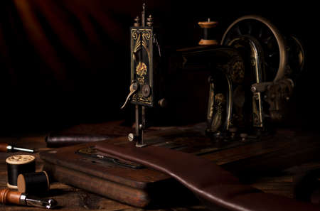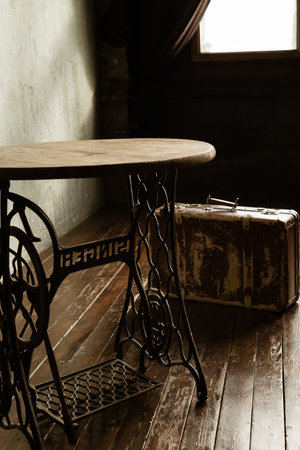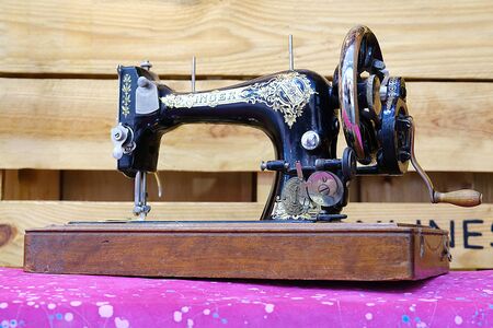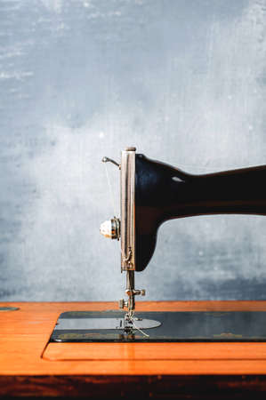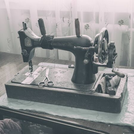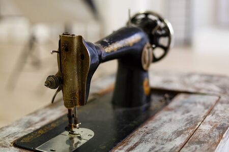 Old sewing machine on a wooden table in a workshop. Vintage styles.