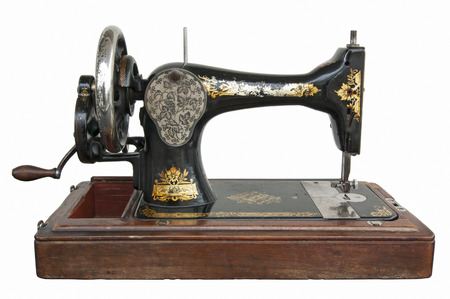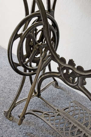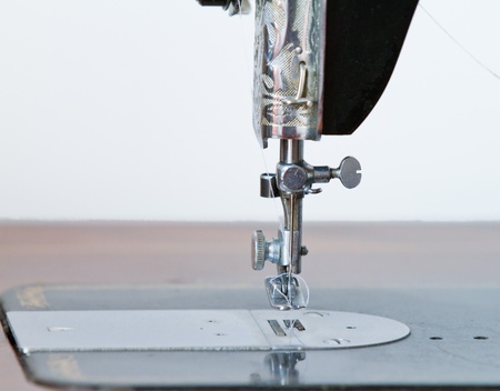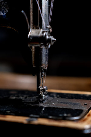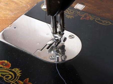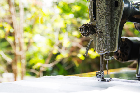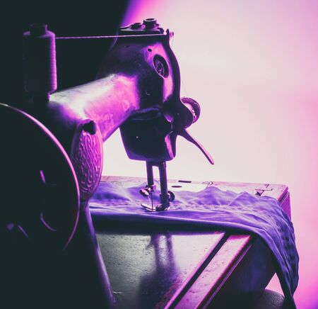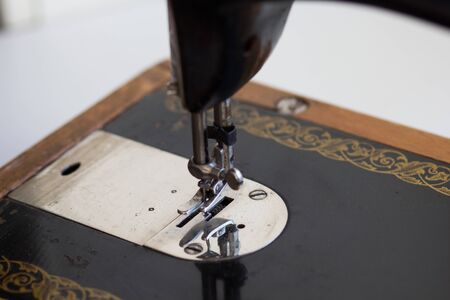 Close up - Old sewing machine, sewing machine and item of clothing, The old sewing machine. Vintage