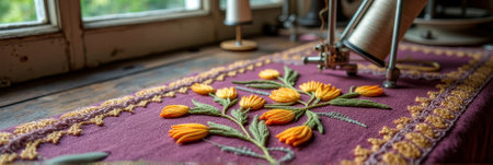 Vibrant floral embroidery on purple fabric with vintage sewing machine near wooden window. That the image is generated using AI.