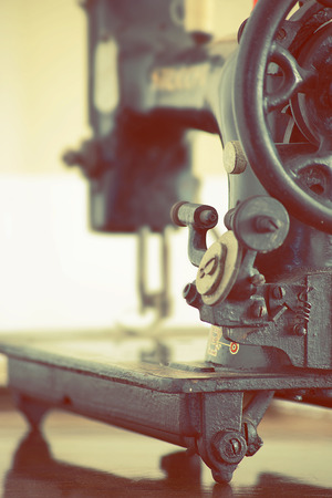 Vintage sewing machine on old wooden table in workshop. Selective focus.