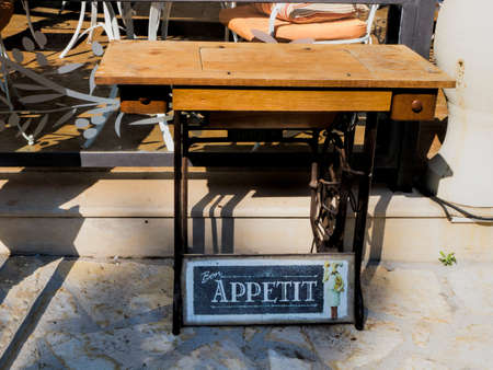 A treadle sewing machine advertising outside a restaurant in the village of Skala in Kefalonia Greece