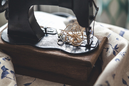 Still life with a sewing machine. Vintage sewing machine, scissors and a skein of threads closeup. View from above