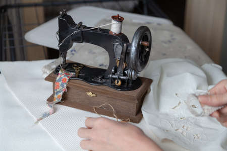 vintage sewing machine with a spool of white thread stands on a white fabric. Nearby female hand holds cloth