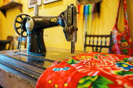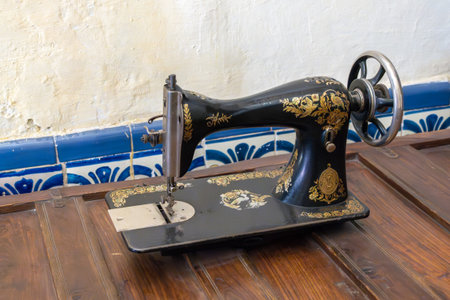 A vintage sewing machine with gold and silver decorations. The machine is on a wooden surface. Historic center of Querétaro, colonial architecture, decorations for the celebration of Mexico's Independence Day.