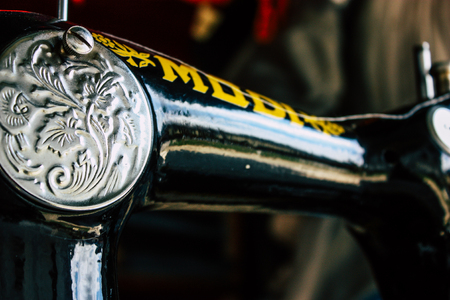 Pokhara Nepal September 25, 2018 Closeup of an old pedal sewing machine of a Nepalese tailor working in the streets of Pokhara in the afternoon