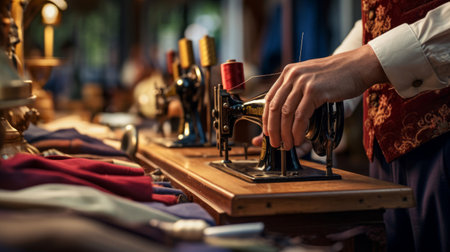 Tailor antique equipment sews old fashioned garments professionally generated by artificial intelligence
