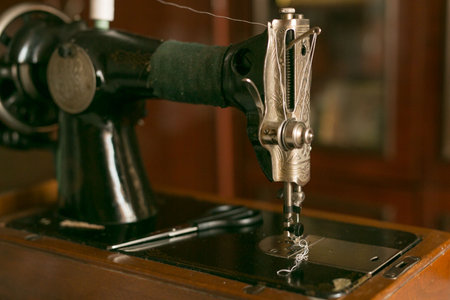 Sewing head of the vintage household manual sewing machine on a table, view of machine fragment in selective focus,