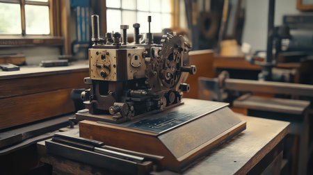 A captivating display of vintage printing press equipment arranged on wooden tables in an old workshop, highlighting manual craftsmanship and industrial heritage.