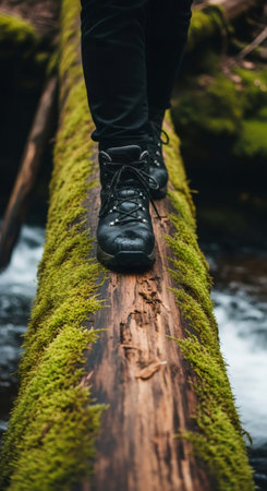 Person wearing hiking boots balances on mossy log over river. Adventure tourism and daring expedition for a rock climber.