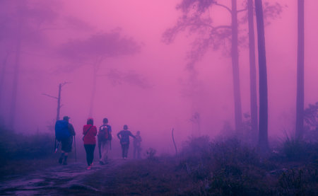 Group of diverse hikers walking along a misty forest path, surrounded by towering trees and rich earthy tones, capturing the essence of outdoor adventure