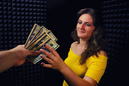 A young woman smiles getting money for work in a recording Studio. The moment of transfer of dollars from hand to hand for the singer behind the microphone.