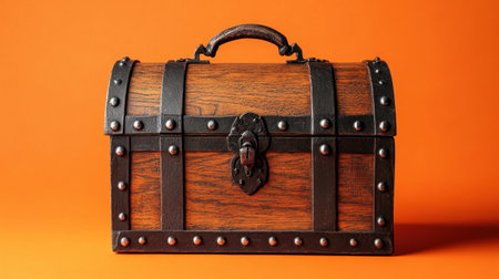 A beautifully crafted wooden treasure chest with intricate metal accents, set against a bold orange background. Ideal for creative projects and artistic displays.