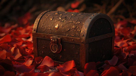 An exquisite vintage treasure chest rests among vibrant red rose petals, highlighting intricate designs and an antique key in warm, soft light.