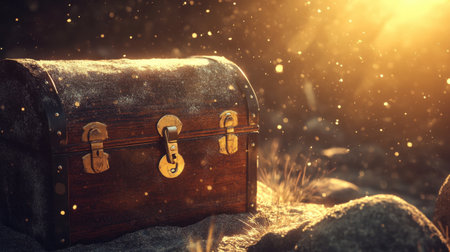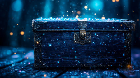 mysterious treasure chest sits on wooden surface, surrounded by shimmering particles of light. enchanting atmosphere evokes sense of wonder and adventure.