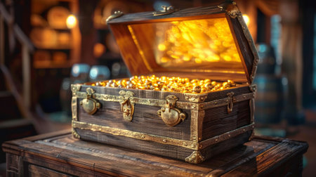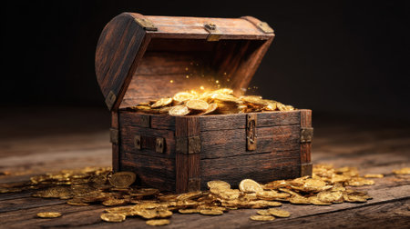 This captivating image features a treasure chest overflowing with golden coins, radiating light and sparkle. The wooden surface enhances the magical atmosphere, perfect for themes of adventure and abundance.