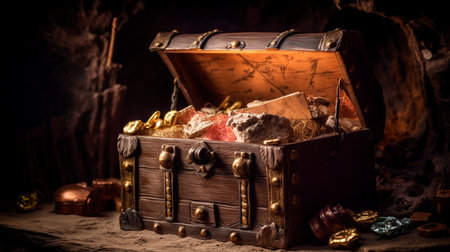 A weathered wooden treasure chest, open and filled with sparkling treasures, symbolizing the allure of adventure and exploration.