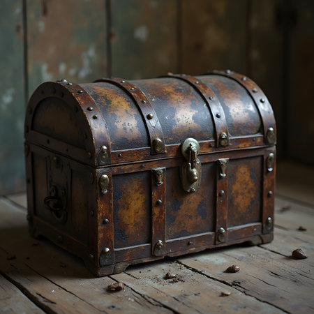 A vintage wooden chest with metal accents and a textured surface, set on a rustic wooden table in soft, atmospheric lighting.