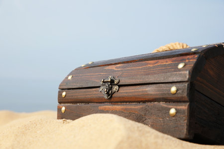 A vintage, weathered wooden treasure chest with rusted metal straps and a large lock sits on a sandy beach. This classic image represents pirates, adventure, hidden treasure, mystery, wealth, and discovery.