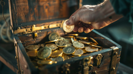 A wooden box filled with gold coins. The coins are of different sizes and shapes, and they are all shiny and golden. The box is open, revealing the treasure inside. Concept of wealth and abundance